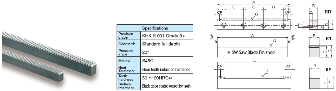 Module N/A 6.3662 | Effective No. of Teeth N/A 50 | Shape N/A RF | Total Length Rack (A) N/A 39.370 in1000 mm | Face Width (B) N/A 2.362 in60 mm | Height (C) N/A 2.362 in60 mm | Height To Pitch Line (D) N/A 2.111 in53.63 mm |