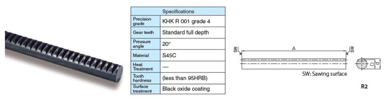 Module N/A 0.7958 | Circular Pitch N/A 2.5 | Effective Number of Teeth N/A 200 | Shape N/A R2 | Total Length Rack (A) N/A 19.882 in505 mm | Outer Diameter (d) N/A 0.394 in10 mm | Height To Pitch Line (D) N/A 0.362 in9.2 mm |