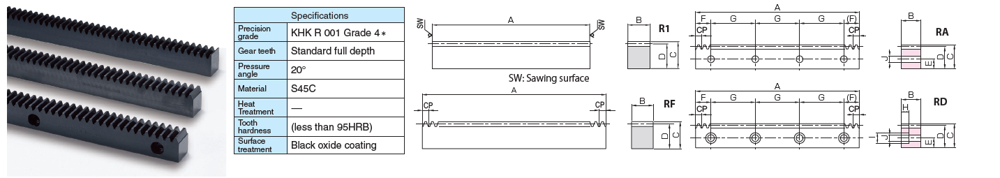 This is a strong rack made of Chromoly steel, treated by carburizing. Has high-strength, high wear resistance, and enables downsizing of SR racks. J Series products are also available.