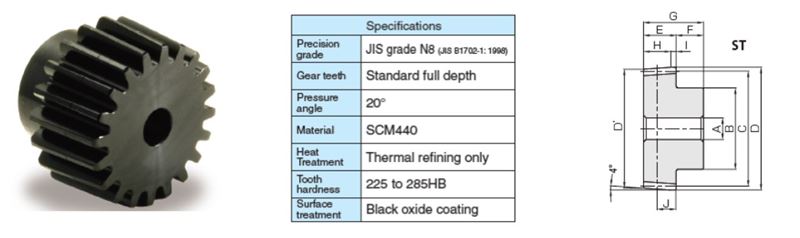 Module N/A 1.5915 | Circular Pitch N/A 5 | No. of Teeth N/A 25 | Shape N/A ST | Bore Diameter (A) N/A 0.394 in10 mm | Pitch Diameter (C) N/A 1.567 in39.79 mm | Outer Diameter (D) N/A 1.733 in44.02 mm | Total Length (G) N/A 1.299 in33 mm |