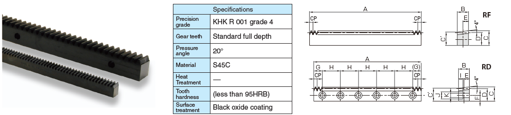 Module N/A 3.1831 | Effective No. of Teeth N/A 100 | Shape N/A RF | Total Length Rack (A) N/A 39.370 in1000 mm | Face Width (B) N/A 1.181 in30 mm | Height (C) N/A 1.358 in34.5 mm | Height To Pitch Line (D) N/A 1.192 in30.27 mm |
