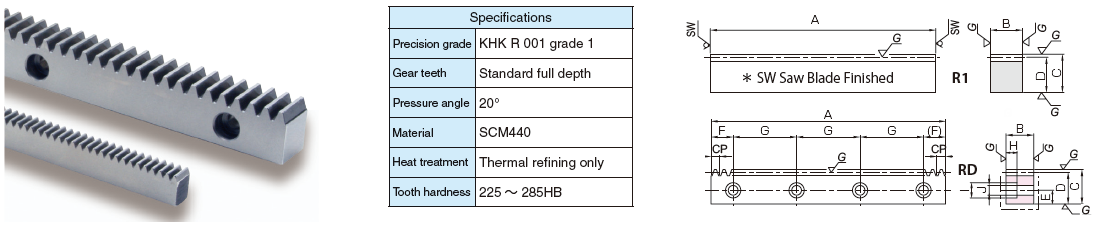 Module N/A 3.1831 | No. of Teeth N/A | Effective No. of Teeth N/A 49 | Shape N/A R1 | Total Length Rack (A) N/A 19.882 in505 mm | Face Width (B) N/A 1.181 in30 mm | Height (C) N/A 1.378 in35 mm | Height To Pitch Line (D) N/A 1.253 in31.82 mm |