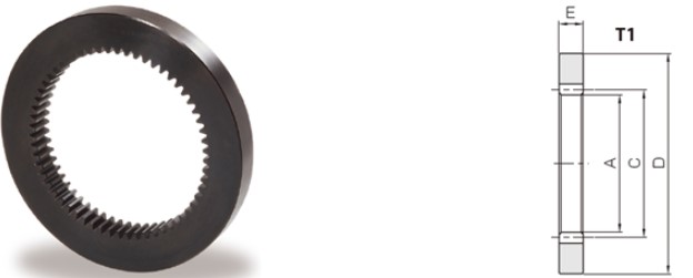 Module N/A 1 | No. of teeth N/A 100 | Shape N/A T1 | Internal Diameter (A) N/A 3.858 in98 mm | Pitch Diameter (C) N/A 3.937 in100 mm | Face Width (E) N/A 0.394 in10 mm |