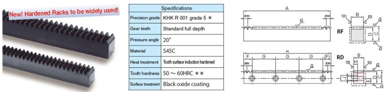 Module N/A 5 | Effective No. of Teeth N/A 64 | Shape N/A RF | Total Length Rack (A) N/A 39.579 in1005.31 mm | Face Width (B) N/A 1.969 in50 mm | Height (C) N/A 1.969 in50 mm | Height To Pitch Line (D) N/A 1.772 in45 mm |