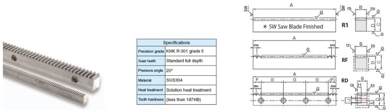 Module N/A 4 | Effective No. of Teeth N/A 80 | Shape N/A RF | Total Length Rack (A) N/A 39.579 in1005.31 mm | Face Width (B) N/A 1.575 in40 mm | Height (C) N/A 1.772 in45 mm | Height To Pitch Line (D) N/A 1.614 in41 mm |