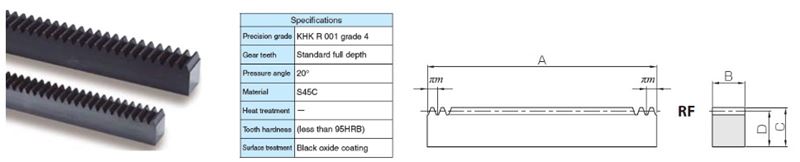 SRF3-1000 $332.67 CAD N/A CAD Icon (for items table) Module N/A 3 Effective No. of Teeth N/A 106 Shape N/A RF Total Length Rack (A) N/A 39.332 in999.03 mm Face Width (B) N/A 1.181 in30 mm Height (C) N/A 1.378 in35 mm Height To Pitch Line (D) N/A 1.260 in32 mm Internal ID N/A